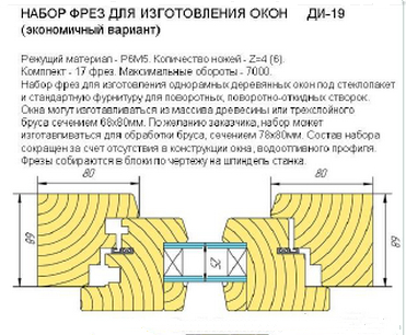 ДИ-19 Набор фрез для изготовления деревянных окон под стеклопакет и фурнитуру, тип "Немецкое окно", профиль 68х80мм, эконом-вариант.