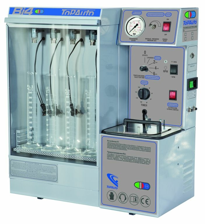 Установка ультразвуковая для проверки и промывки 4 форсунок TopAuto BI4 предназначена для контроля и слежения за состоянием систем впрыска бензина (системы FSI, GDI, установленные на машины VWAGEN, FORD, PSA, MITSUBISHI, ALFA ROMEO и др.) и новых инжекторов для газовых систем GPL. Широко используются в различных автосервисах и на станциях техобслуживания автомобилей, в том числе некрупных (это позволяет компактный размер установки).