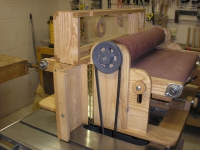 Ведущий барабан крепко фиксируется на шкив электромотора. Натяжной барабан устанавливается на ось с подшипниками — он свободно вращается. Чтобы абразивный материал касался рабочей поверхности мягко, под ведомым цилиндром стол немного скашивается. Барабаны желательно сделать из деревянных заготовок. Однако возможны и другие варианты, которые непременно обклеиваются тонкой резиной.
