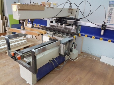 Одно из главных его преимуществ является система револьверного типа на 6 позиций для быстрой смены глубины сверления. Второе преимущество наличие автоматической системы уменьшения глубины сверления на 10 мм при переходе сверлильной группы в вертикальное положение (сверление в пласти). К минусам станка можно отнести сплошную гребенку, которая позволяет сверлить отверстия большого диаметра только с помощью дополнительной регулировки суппорта со шпинделями.