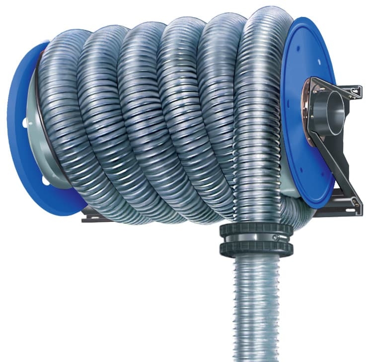 В нерабочем состоянии вытяжной шланг намотан на барабан катушки, при этом свободный конец шланга с газоприемной насадкой не касается пола и не мешает работе. Для подключения к выхлопной трубе автомобиля шланг разматывается на необходимую длину, при отсоединении шланг наматывается обратно на катушку под действием возвратного механизма (механического привода, расположенного внутри барабана). Фиксатор удерживает барабан в требуемом положении.