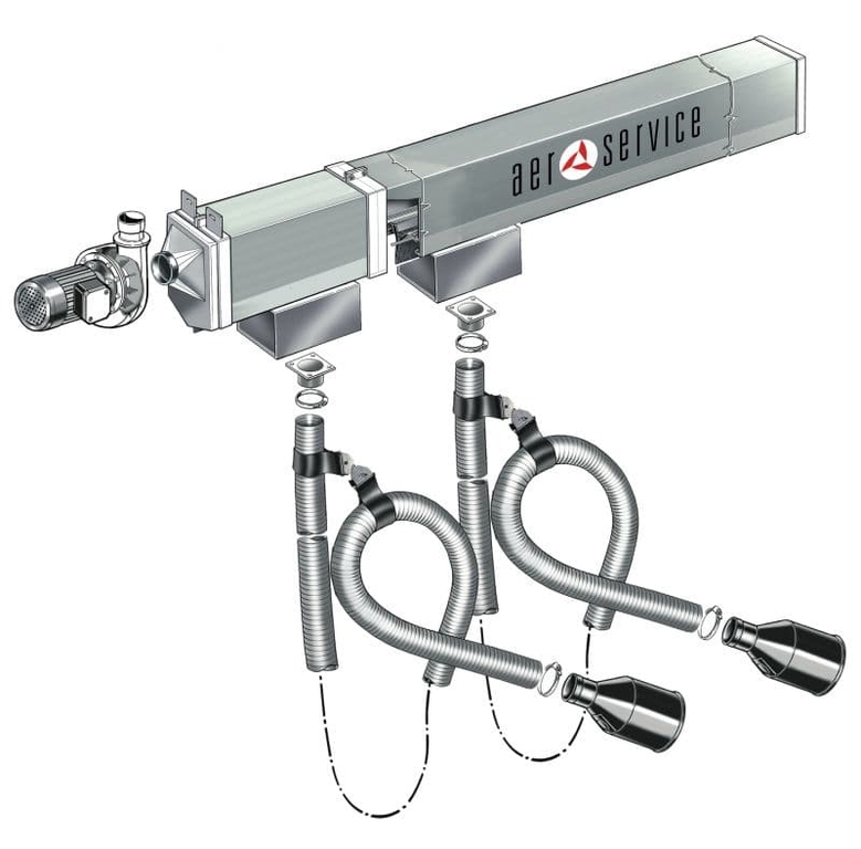 Рельсовая система вытяжки Aerservice KITCA222100120 широко используется в автомобильном секторе, потому что единственный коллектор всасывания выхлопных газов может перемещаться по многочисленным постам. Система, поставляется заранее смонтированная и полная всех необходимых конструкций для установки на стену, комплектация вентилятором связь с линией выброса паров в атмосферу.