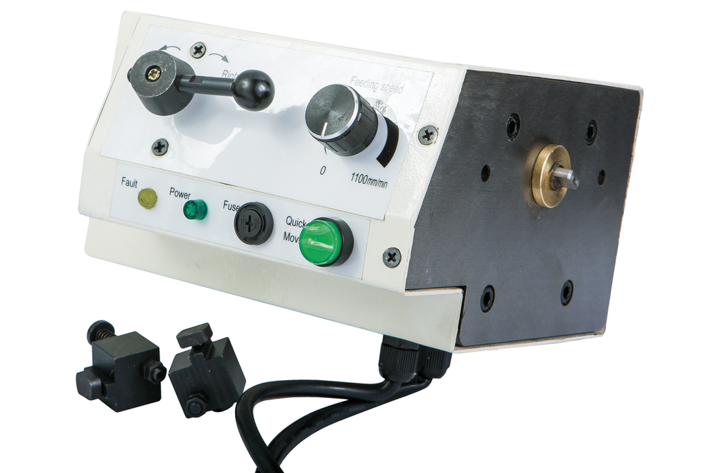 автоматизация, подача материала, производительность, точность, быстрота Автоматическая подача по оси X представляет собой вариант основной оснастки станочного оборудования, выпускаемого компанией JET. Устройством оснащается фрезерно-сверлильный станок марки JUM-X2. Приспособление обеспечивает управление подачей рабочего стола по оси Х в автоматическом режиме, снижая временные затраты на обработку деталей. Приспособление устанавливается на торцевой части рабочего стола и снабжено удобными кнопками для управления. Конструкция автоматической подачи предусматривает возможность быстрого перемещения рабочего стола с установленными деталями в рабочую зону.