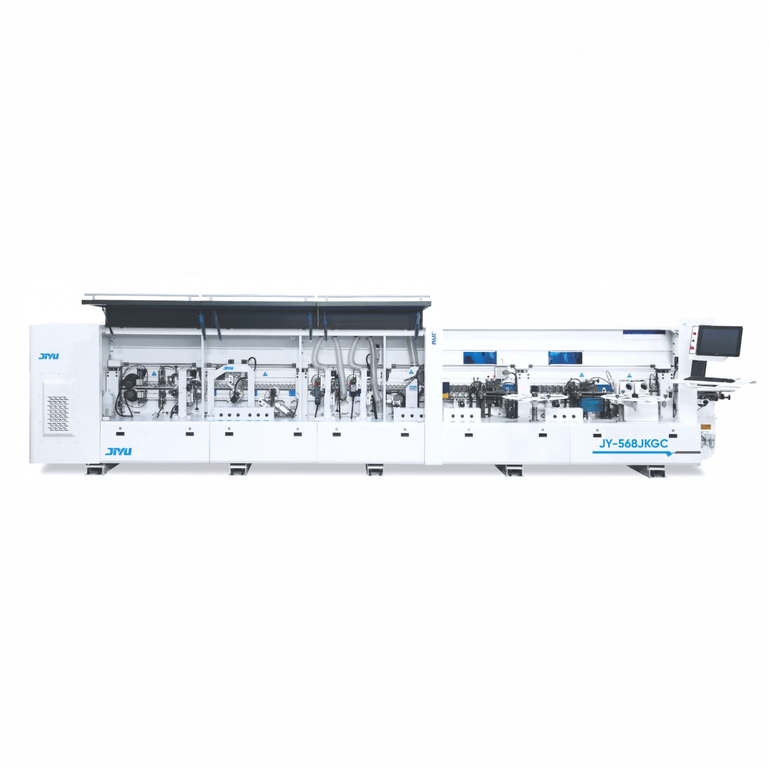 Автоматический кромкооблицовочный станок JIYU JY-568JKGC предназначен для облицовывания прямолинейных кромок плитных материалов рулонными кромками АБС, ПВХ и полосовым кромочным материалом.