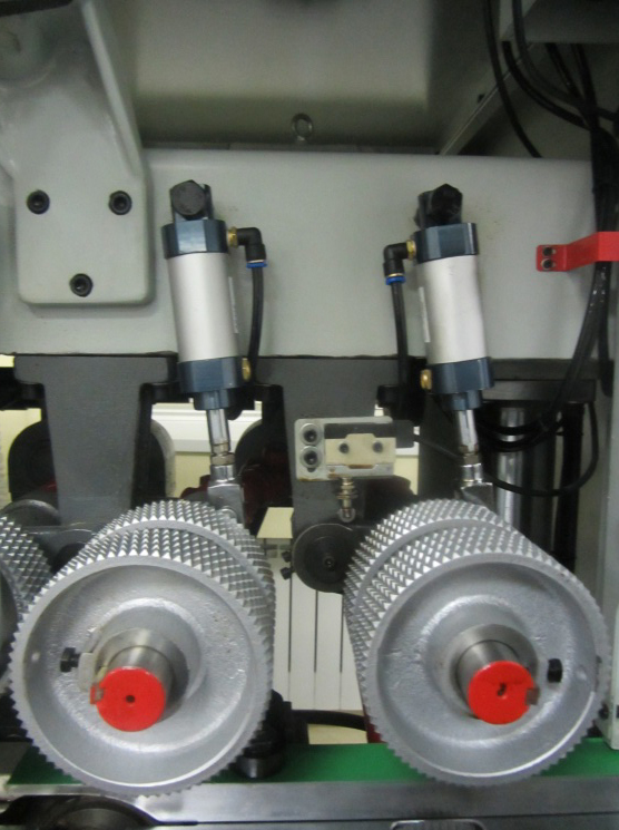 Прижим подающих роликов к заготовке осуществляется с помощью пневмоцилиндров, обеспечивающих стабильное и равномерное усилие прижима для плавной и надежной подачи заготовок, что обеспечивает высокую точность и чистоту обработки. |