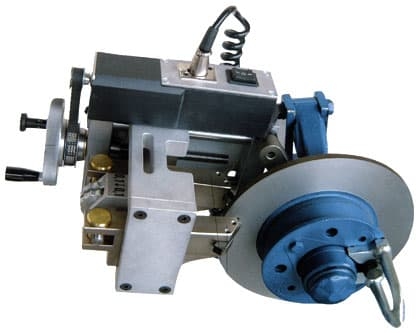 - При включении питания приводного модуля, ступица автомобиля вместе с тормозным диском приводится в движение, резцы токарного модуля перемещаются вдоль диска, обрабатывая одновременно обе его поверхности.
