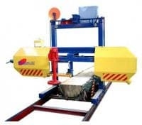 Распиловка производится широкой ленточной пилой, вращающейся через два шкива. Подача пильного узла по рельсовому пути осуществляется от электромеханического привода. На пилораме установлен мотор-редуктор и частотный преобразователь итальянского производства. Длина направляющих рельс 9 м.