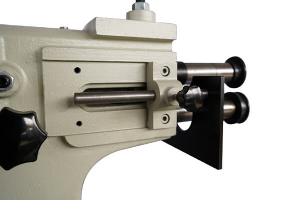 Продольная регулировка нижнего вала осуществляется за счет боковой рукоятки, которая позволяет настраивать требуемый вылет нижнего ролика. Чтобы нижний вал не смещался во время работы его необходимо зафиксировать специальным маховиком. Максимальный вылет роликов станка составляет 140 мм. |