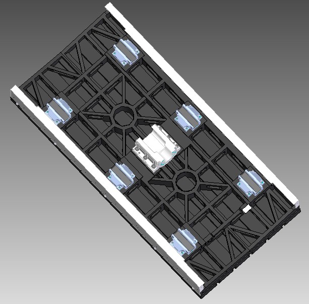 Рабочий стол Количество кареток качения по оси X равно 6. Рабочий стол с оребрением и максимальной нагрузкой по массе заготовки до 1500 кг. |