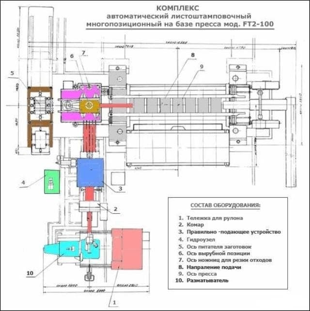 Комплекс автоматический листоштамповочный многопозиционный FT2-100Предназначен для холодной штамповки деталей из ленточного рулонного материала и штучных заготовок.
