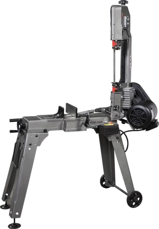 Модель представляет JET HVBS-56M собой ленточнопильный станок да пиления металлических заготовок. Станок рассчитан на мелкосерийное производство, пригоден для индивидуальной работы. Модель рассчитана на обработку металлических заготовок диаметром до 125 мм, оснащена тяжелой рамой, которая в процессе работы опускается в ручном режиме непосредственно оператором. Конструкция станка соответствует оборудованию американского типа, предназначена для распила заготовок под прямым углом. Пиление заготовок под разными углами осуществляется за счет поворота губок тисков в диапазоне 0-45°. Модель HVBS-56М оснащена компактным электродвигателем мощностью 650 Вт. Станок имеет ременной привод, обеспечивающий движение ленточного полотна в 3-х скоростном режиме, 20,30 и 50 м/мин. Моторная группа имеет систему воздушного охлаждения. На раме установлены направляющие, регулирующие позиционирование полотна при пилении заготовок различного диаметра. Сокращение расстояния между направляющими уменьшает увод полотна, повышает качество распила. Необходимая точность распила достигается благодаря наличию в конструкции станка подшипников, установленных непосредственно в направляющих. Задача подшипников обеспечить постоянное перпендикулярное положение полотна по отношению к заготовке в процессе распила. Натяжение полотна регулируется вручную. Для этой цели слева, в торцевой части станочной рамы имеется маховик. Заготовки крепятся на станок при помощи механических тисков. Наличие концевого упора позволяет быстро установить заготовку в тисках в необходимом положении. С помощью упора достигается быстрая переустановка заготовки для выполнения последующей однотипной операции. Подача охлаждающей и смазывающей жидкости осуществляется в ручном режиме. Станок имеет удобный корпус, оборудованный роликовыми колесами. Вес всей конструкции составляет 50 кг, позволяющий легко передвигать станок с места на место, осуществлять его транспортировку на другие объекты.Преимущества станка JET HVBS-56M