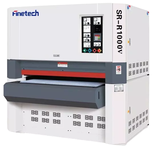 FineTech SFR-R 1000V – имеет не подвижный рабочий стол, размер настраивается непосредственно на самом узле шлифования, поэтому данный станок идеально встраивается в линии шлифования или в линии по УФ нанесению лакокрасочных материалов.