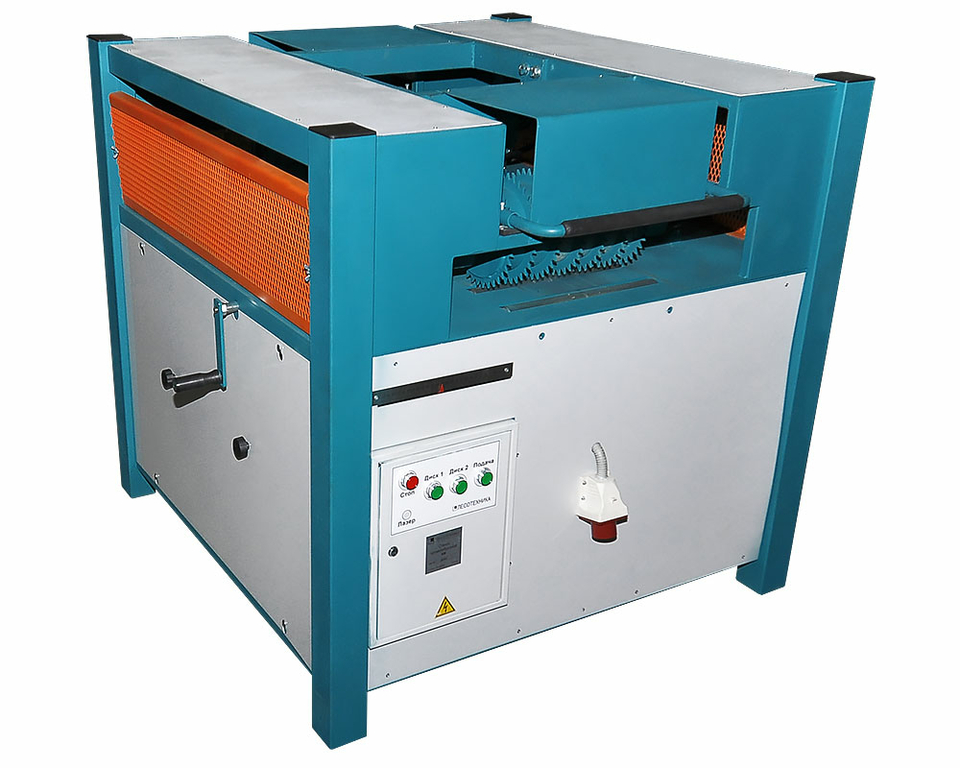 Пиление осуществляется двумя дисковыми пилами диаметром 400 мм, одна из которых неподвижна, а вторая имеет плавную регулировку. Использование дисковых пил диаметром 400 мм уменьшает толщину пропила и стоимость таких пильных дисков также невысока.