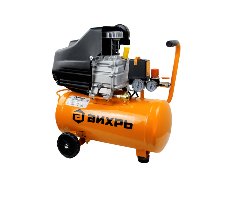 Компрессор ВИХРЬ КМП-24/230АМ используется для нагнетания сжатого воздуха в различное пневмооборудование в ходе строительно-ремонтных работ в квартире или на даче. Максимальная производительность компрессора 230 литров в минуту, объем ресивера 24 литров.Особенности: - Есть транспортировочные колеса и удобная ручка для переноски. - Манометр позволяет контролировать давление в ресивере и на выход. - Через смотровое окно можно следить за уровнем масла в компрессоре. - Электромеханический блок управления давлением в ресивере. - Предохранительный механический клапан высокого давления. - Дренажный клапан для слива конденсата.Перед каждым пуском проверяйте уровень масла по меткам на окне маслоуказателя картера. Уровень масла должен быть не ниже среднего положения в контрольном окне картера. При необходимости доливайте масло. Категорически запрещается смешивать различные сорта масла