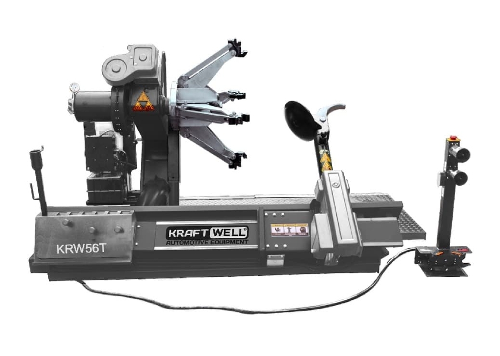 Шиномонтажный станок до 56" для грузовых автомобилей KraftWell KRW56T для монтажа/демонтажа камерных, а так же бескамерных шин грузовиков, сельскохозяйственной, и строительной техники с диаметром диска от 14 до 56 дюймов и шириной до 1020 мм.