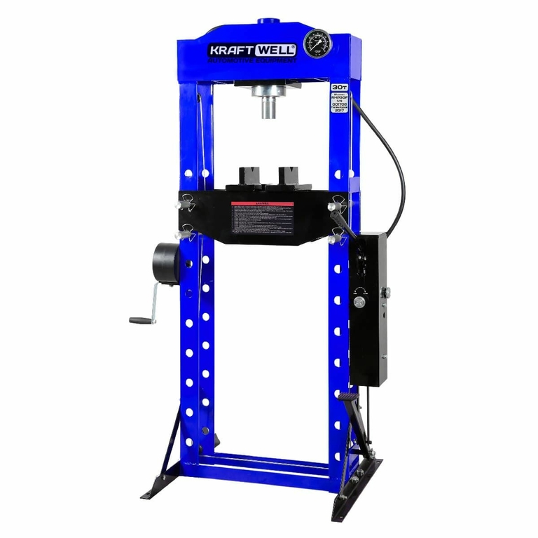 Пресс с ручным и ножным приводом KraftWell KRWPR30F 30 тн. необходим в любом автосервисе, автомастерской или даже гараже постоянно требуется проведение операции по выпрессовке/запрессовке таких деталей, как ступичный подшипник или сайлентблоки рычагов. Ранее проведение данной операции вручную требовало значительных трудовых и временных затрат. С появлением гидравлических прессов этот трудоемкий процесс значительно упростился и стал безопаснее, а широкая линейка прессов с различным максимальным усилием позволяет подобрать наиболее подходящий для выполнения тех или иных задачи. Гидравлические прессы KRAFTWELL, в отличие от более дешевых аналогов, изготавливаются на современном и высокоточном оборудовании одного из ведущих заводов в Китае и исключительно из высококачественных материалов в соответствии с европейскими нормами безопасности и стандартами качества, что гарантирует длительный период эксплуатации и безопасность при работе. Качество подтверждено сертификатами EAC и CE.