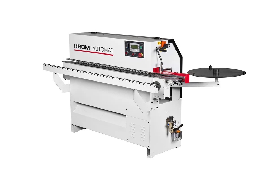 KROM Automat является компактным автоматическим кромкооблицовочным станком полного цикла. Т.е после приклеивания детали нет необходимости в какой-то ручной доработке. Станок приклеивает кромку, предварительно отрубает ее от бобины, фрезерует по длине (одновременно сверху и снизу), в чистовую торцует кромку заподлицо с деталью и в финале полирует. Высокое качество комплектующих и сборки. Компактный размер позволит установить станок в относительно небольшом помещении. Все проданные станки данной серии продемонстрировали отличное качество кромкооблицовки. Станок хорошо держит настройки, а при необходимости легко перенастраивается между различными вариантами кромки.