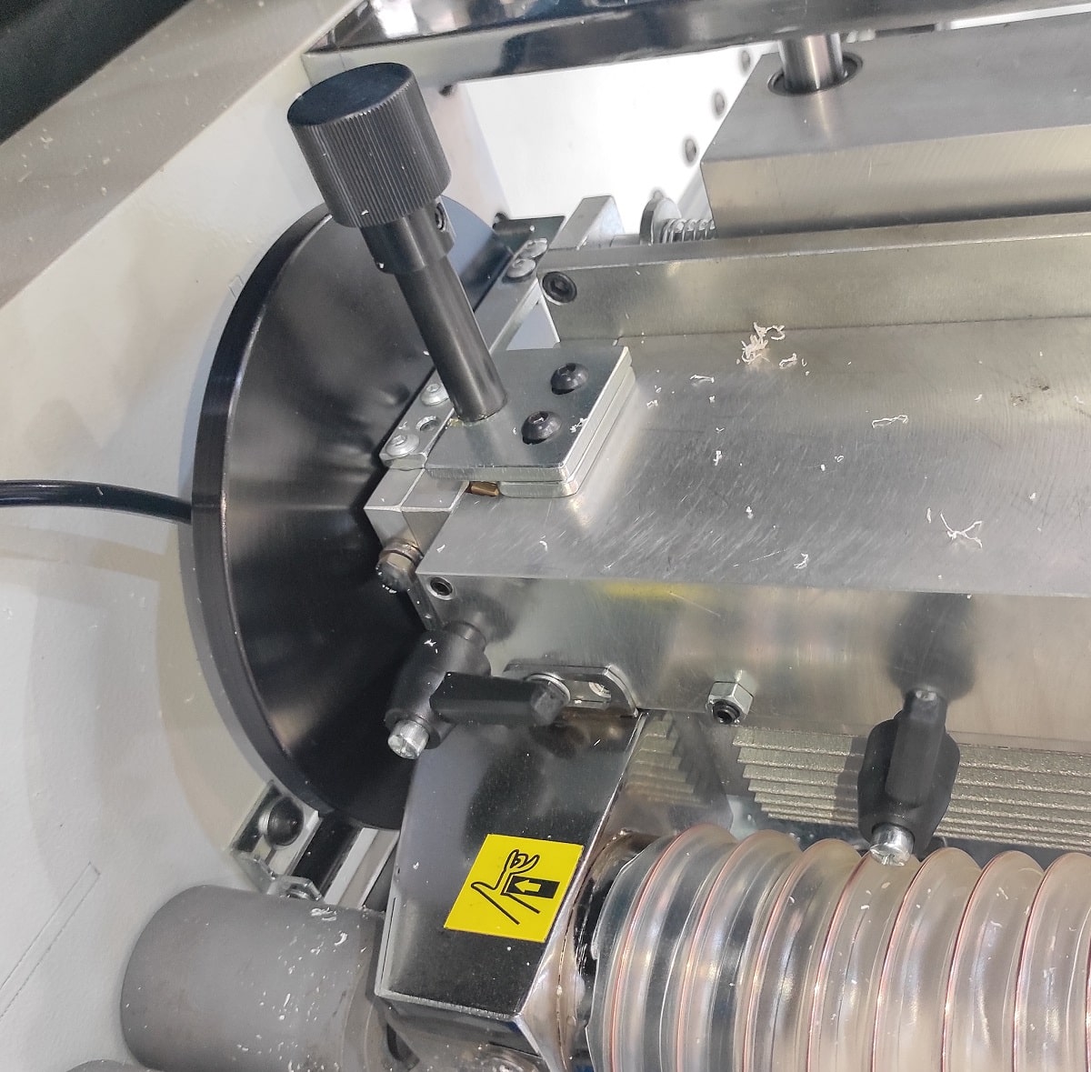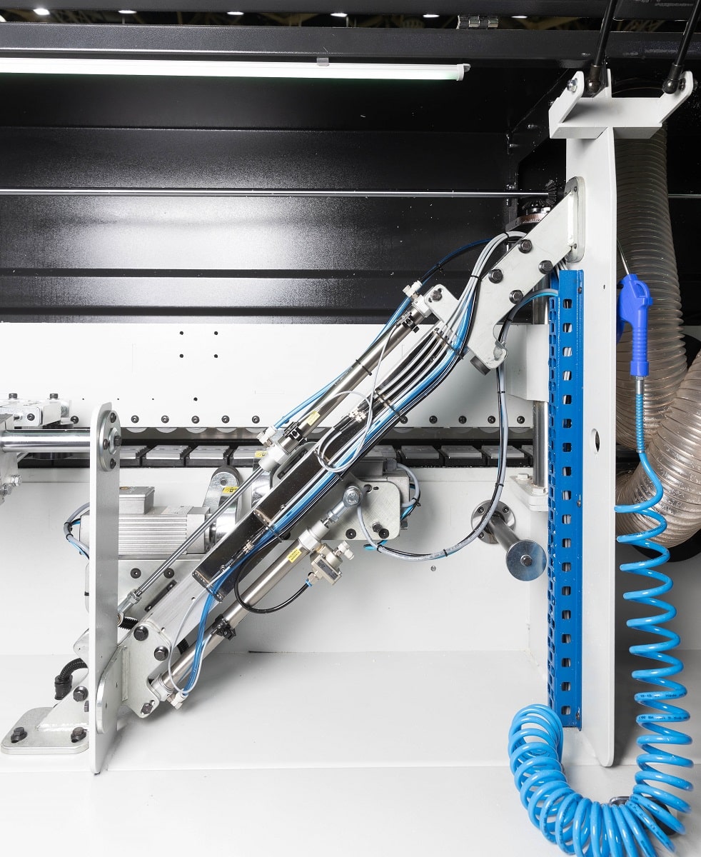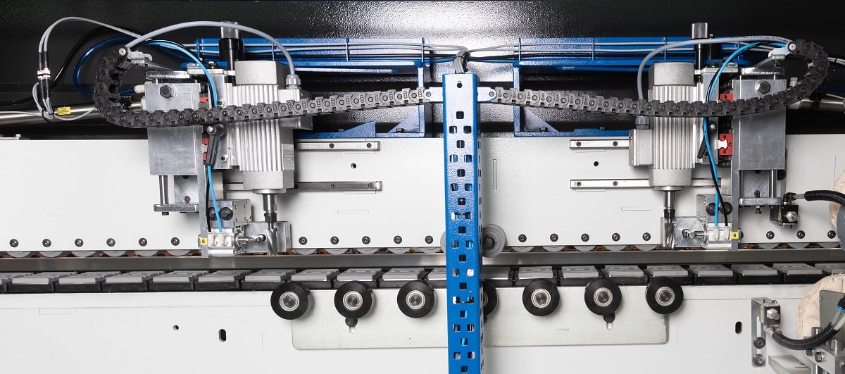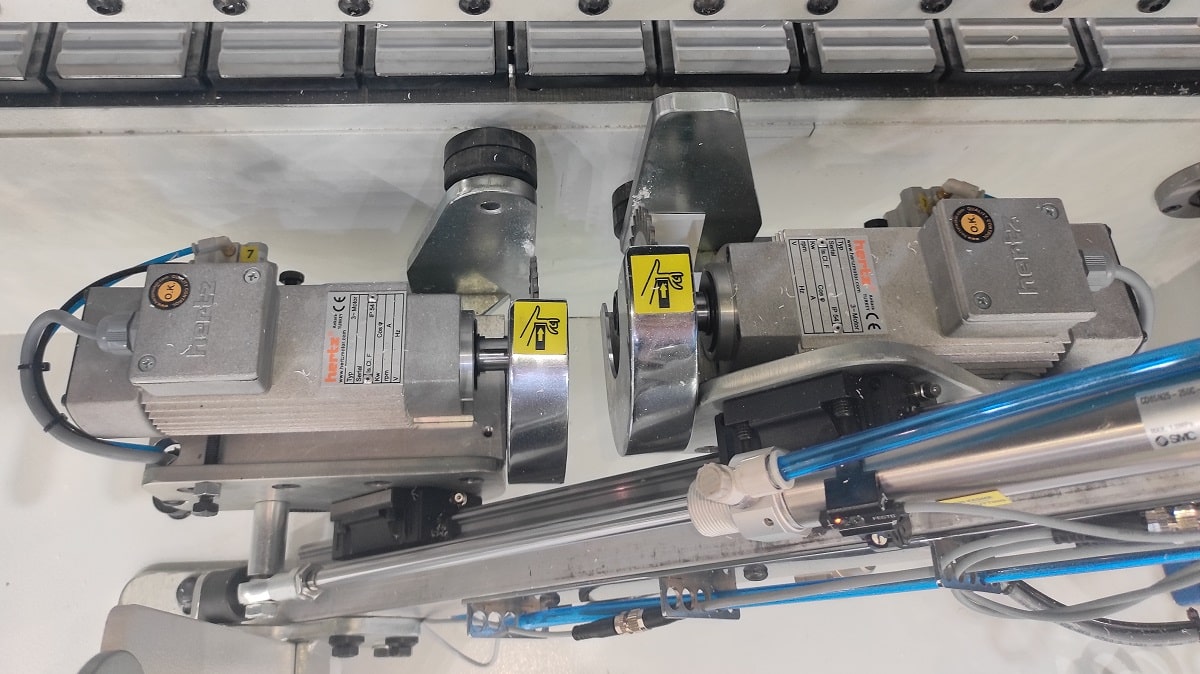 ФРЕЗЕРНЫЙ УЗЕЛ ОБРАБОТКИ ЧЕТВЕРТИ Вовремя кормлено дверей с четвертью торцовочного узла недостаточно, для этих целей на станке установлен специальный фрезерный узел обрабатывает внутренних свесов по торцу. Данный узел позволяет деликатно обработать кромку в труднодоступном месте, в котором штатным инструментом обыкновенного кромкооблицовочного станка не достать. Агрегаты перемещаются по призматическим линейным направляющим. Подход фрезы к внутреннему торцу двери во время обработки осуществляется при помощи уникальной системы двойного копира. Благодаря чему точность позиционирования фрезы относительно заготовки увеличивается, а плавность отхода при срабатывании пневмоцилиндра позволяет стабилизировать обработку. Узел оснащен двумя премиальными высокобортными двигателями от Турецкого производителя Hertz.