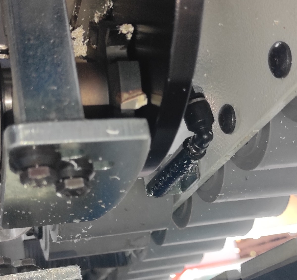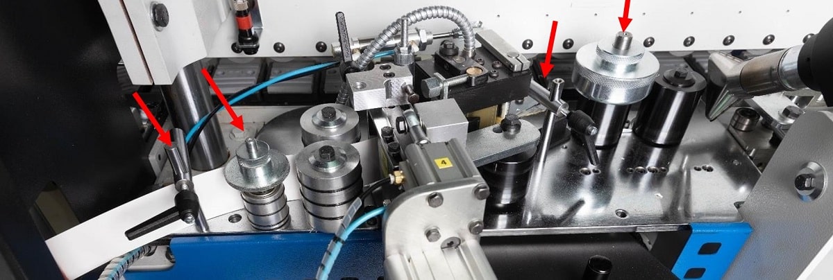 МЕХАНИЗМ ПОДАЧИ КРОМКИ Для стабильной подачи широкой кромки, которая может достигать в высоту 65мм на станке используется система ограничителей в виде штоков, пальцев и винтовых шайб. Таким образом кромка, проходя через систему подачи движется стабильно не болтается выше/ниже, что сказывается на этапе приклеивания к торцу двери. |