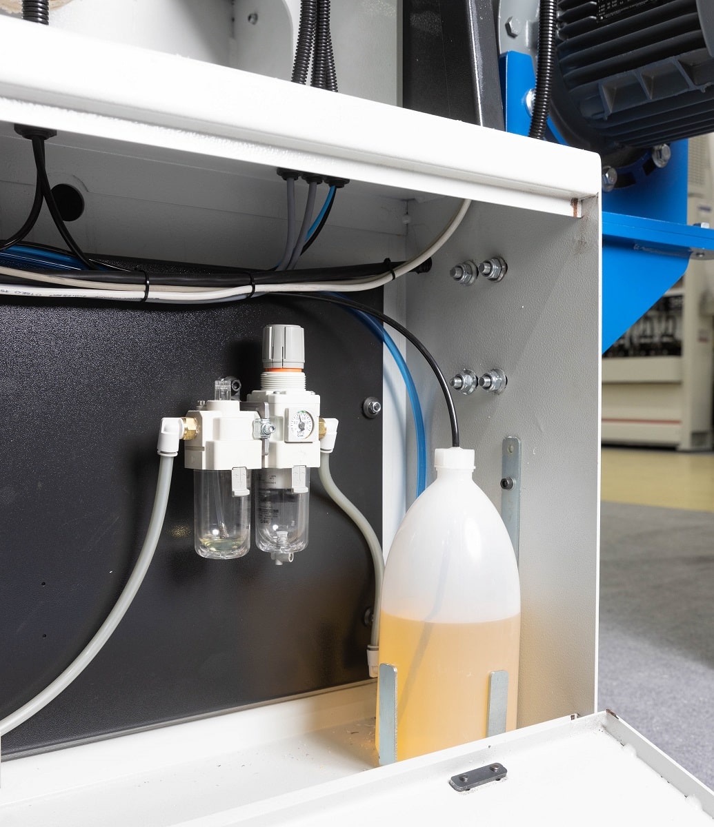 ПОДАЧА ОЧИЩАЮЩЕЙ ЖИДКОСТИ Узел очищающей жидкости, расположен перед узлом полировки и предназначен для устранения следов клея, потёков, пыли, как на стандартных так и деликатных поверхностях. Две форсунки одновременно наносят жидкость сверху и снизу заготовки. Регулировка необходимого количества жидкости осуществляется при помощи жиклеров. |