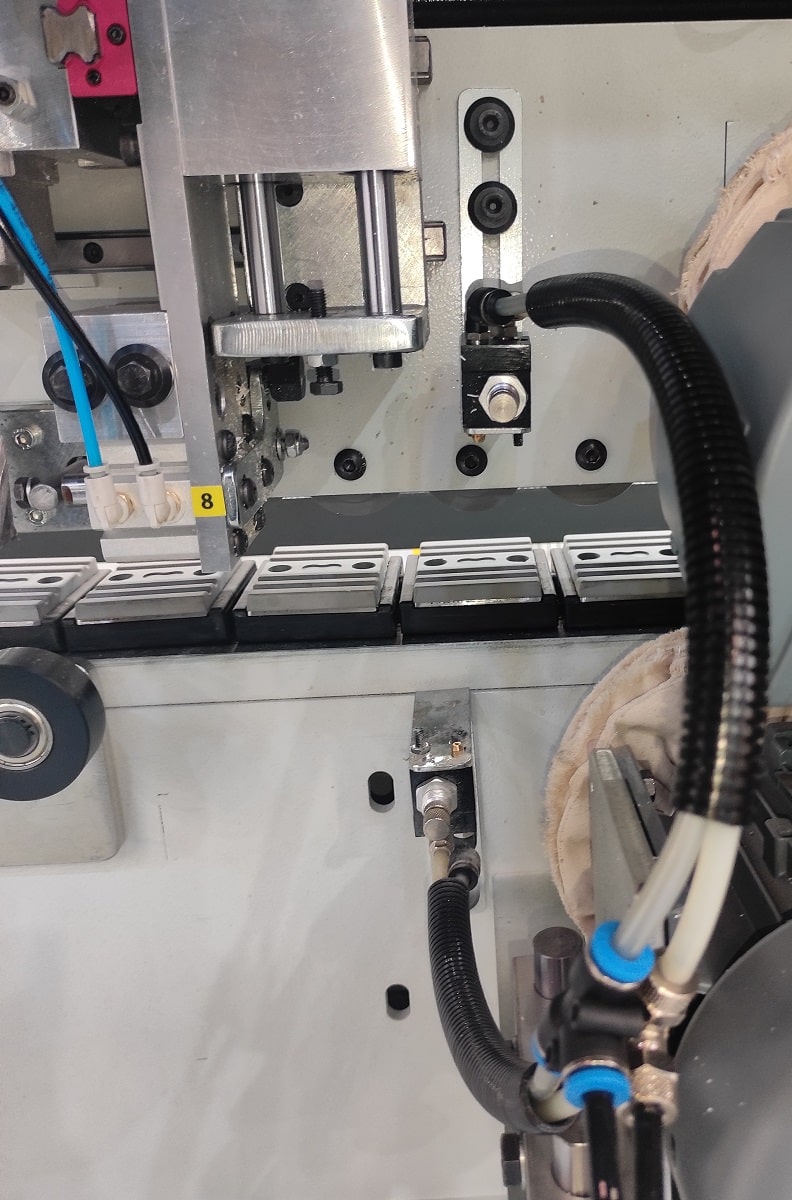 ОГРАНИЧЕНИЕ РАССТОЯНИЕ МЕЖДУ ЗАГОТОВКАМИ Для стабильной работы с соблюдением правильного расстояния между заготовками на станке установлен пневматический цилиндр, который ограничивает запуск последующих деталей. Таким образом обрабатывающие агрегаты имею возможность стабильно работать по времени без аварийных ситуаций. |
