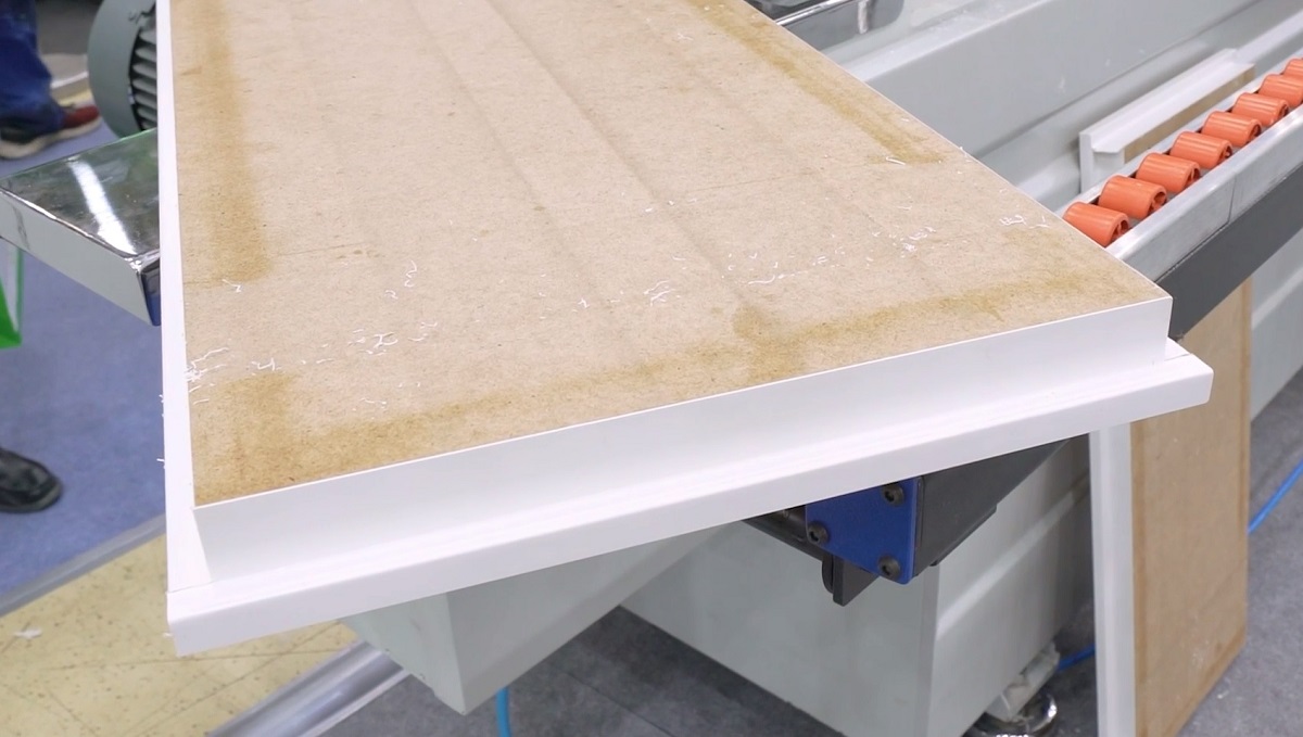 УЗЕЛ ФРЕЗЕРОВАНИЯ СВЕСОВ (ЧЕРНОВОЙ) При использовании неправильно подобранной ширины кромки свес на верхней поверхности детали выступает больше положенного, что приводит к тому, что мотор и фреза не справляются с общим объемом съема. В следствии чего узел на высокой скорости может не успеть обработать кромку и подпрыгнуть, образуя на детали бугорок (необработанную часть кромки). Благодаря разделению на черновую и чистовую обработку заготовки усилие распределяется, что приводит к увеличению моторесурс фрез, а также обеспечивает более качественную и стабильную работу без зарезания, подпрыгивания и дефектов. |