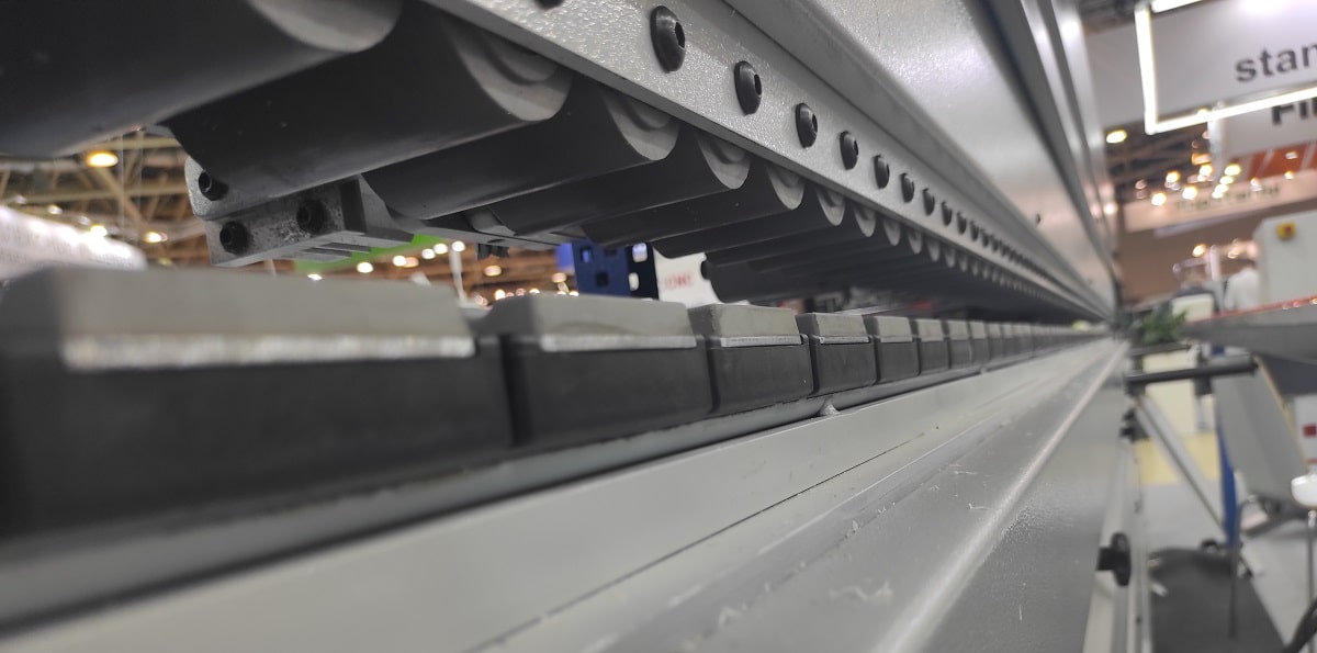 КОНВЕЙЕР Конвейерная лента движется по длинной, во всю длину станка полукруглой стальной направляющей позволяя обеспечить стабильность движения детали во время обработки. Стальная направляющая подвергается специальной термической обработки перед установкой для достижения жесткости.
