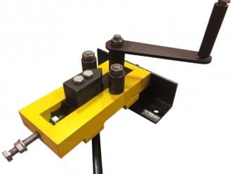 2. Чтобы согнуть заготовку под углом ее устанавливают между роликами и топориком. Затем с помощью рычага (поворачивая его по часовой стрелке) гнем угол. Размер угла может фиксироваться регулировочным болтом, т.е. зафиксировав первый изгиб, все остальные будут одинаковые.