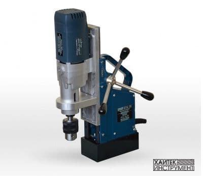 Модель отличается мощным электродвигателем и высокой скоростью вращения шпинделя (650 об/мин). Электромагнитное основание обладает увеличенной прижимной силой (20 кН). Широкая ручка предусмотрена для удобной переноски устройства.