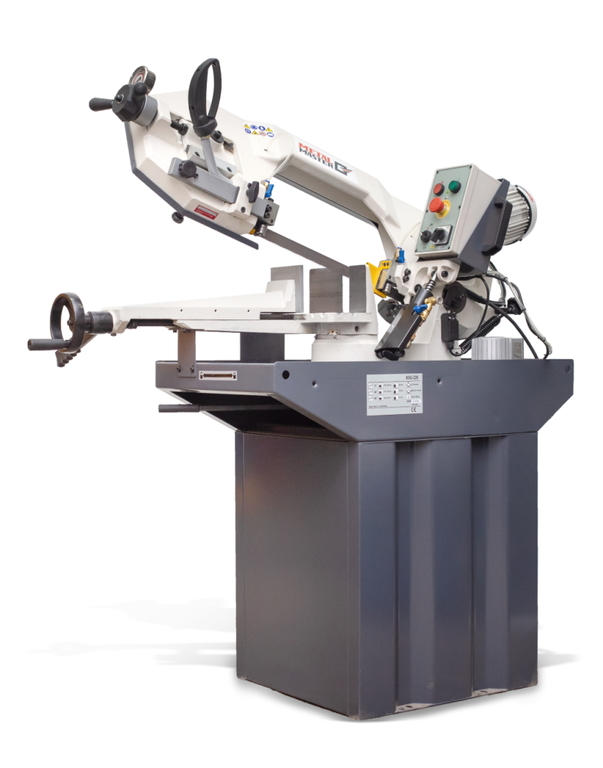 Metal Master BSG-220 – это ручной ленточнопильный станок на европейском типе тумбы, что обеспечивает его высокую жесткость и удобство при распиле заготовок большого диаметра. Предназначен станок для распила заготовок круглого и прямоугольного сечений. Макс. диаметр заготовки при 90 градусов составляет 225 мм, прямоугольник 150х235 мм.