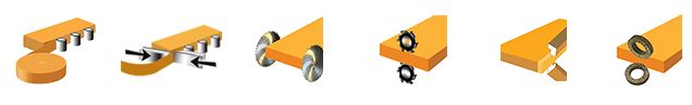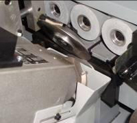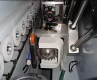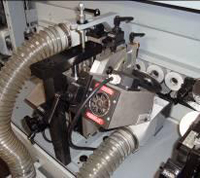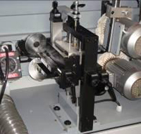 Специальный узел обрезки позволяющий облицовывать деталь натуральным шпоном. Шпон при такой обрезке не ломается, а аккуратно подрезается (тип ножниц). |