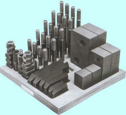 Набор предназначен для фиксации заготовок, деталей сложной формы при дальнейшей обработке на фрезерных, сверлильных и других станках , имеющих ширину паза 15.7-16мм на столе. В набор клиновых прижимов входят: Сухари (резьба М12х1,75) для станочных пазов 15.7мм- 6 шт. Гайка М12х1,75 с буртиком - 4 шт. Гайка М12х1,75 высокая - 4 шт. Клиновые опоры с рифлением - 6 шт. Прихват плоский с рифлением - 6 шт. Шпильки М12х1,75 длиной 75 мм - 4 шт. Шпильки М12х1,75 длиной 100 мм - 4 шт. Шпильки М12х1,75 длиной 125 мм - 4 шт. Шпильки М12х1,75 длиной 150 мм - 4 шт. Шпильки М12х1,75 длиной 175 мм - 4 шт. Шпильки М12х1,75 длиной 200 мм - 4 шт. Для удобства работы набор располагается на открытой деревянной подставке.