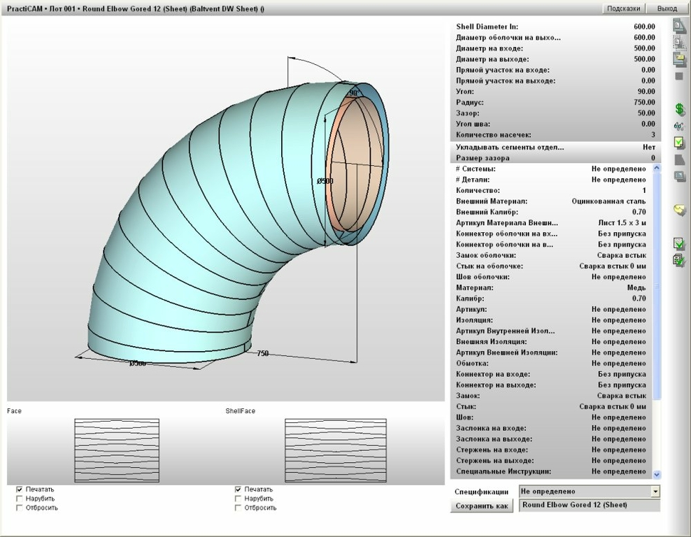 - Работать с трёхмерной графической моделью фитинга, задавать размеры, припуски, материал, определять способ раскроя фитинга.