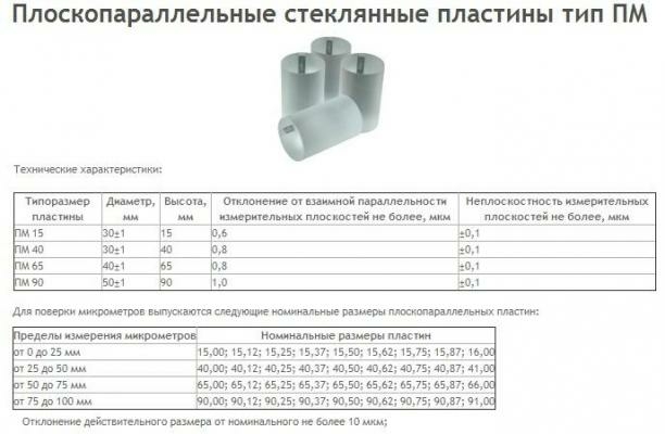 Плоскопараллельные стеклянные пластины предназначены для поверки интерференционным методом плоскостности и взаимной параллельности поверхностей микрометров и скоб. Пластины изготавливаются из стекла марки ГОСТ 3514. Для поверки приборов с разными пределами измерений пластины изготавливаются четырех типоразмеров: ПМ 15, ПМ 40, ПМ 65, ПМ 90. Размер плоскопараллельной стеклянной пластины для поверки микрометров определяется кратчайшим расстоянием между её измерительными плоскостями. Плоскопараллельные стеклянные пластины имеют форму круглых прямых цилиндров с полированными торцевыми поверхностями, являющимися измерительными. Цилиндрическая поверхность пластин должна быть матовой, за исключением площадки, предназначенной для нанесения маркировочных знаков. В комплекте 4шт.