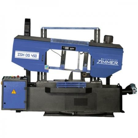 Полуавтоматический ленточнопильный станок ZIMMER ZSH DG 450, предназначенный для пиления труб, профильных и сплошных заготовок, максимальным диаметром круга 350 мм и прямоугольной заготовки 350x450 мм под углом 90°. Для распиловки заготовки под углом 45° предусмотрен поворотный стол.
