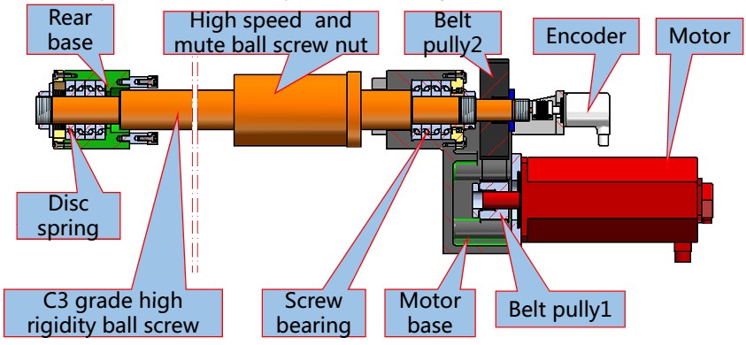 ШВП Вращение ШВП по оси X обеспечивается сервомотором через зубчатый ремень. Это обеспечивает высокую жесткость гайке и гарантирует максимальную эффективность крутящего момента. Дисковая пружина на задней опоре снижает термические деформации винта при росте температуры, что обеспечивает стабильность при длительной обработке. |