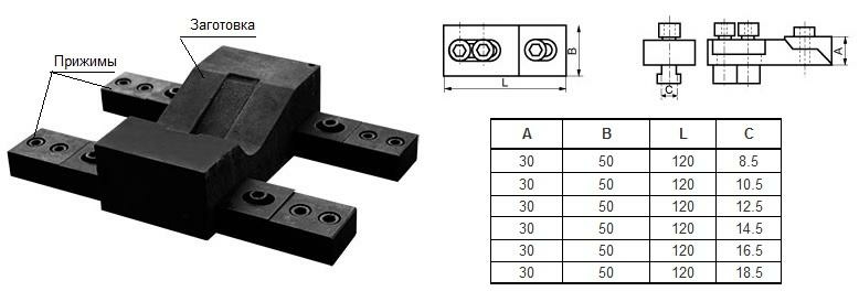 Предназначен для регулировки базирования и фиксации заготовок (деталей), имеющих плоское основание, для дальнейшей обработки на фрезерных, сверлильных и других станках , имеющих ширину паза 19.7мм на столе. Изготавливается из стали 45 с оксидированием, HRC 30-40.