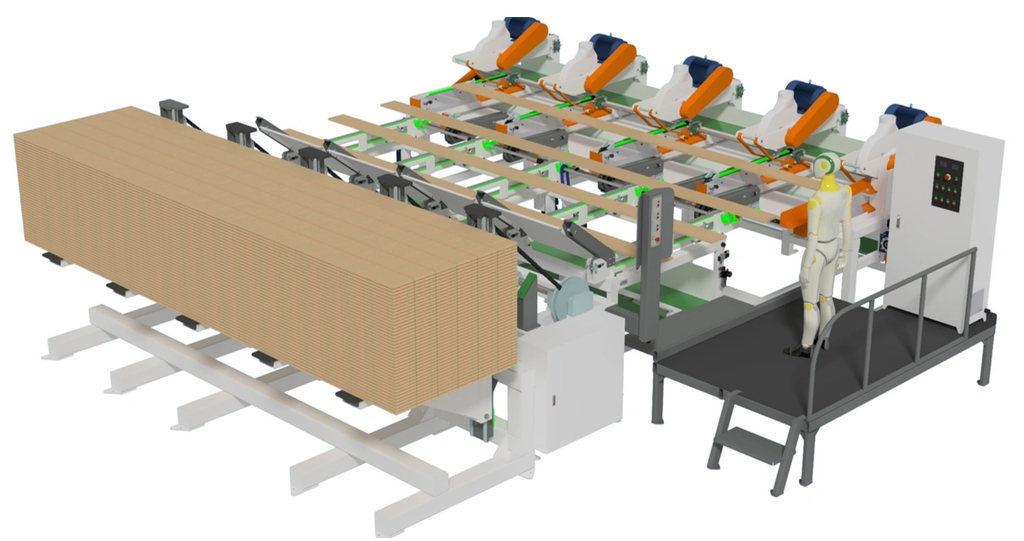 Станок оснащен одним неподвижным (базовым) узлом и одним-семью подвижным пильными узлами, которые можно перемещать по станине |