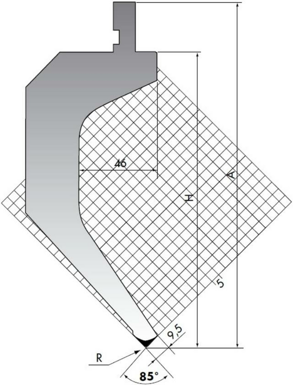 Данным пуансоном возможна гибка листового металла на угол от 85° до 180°. Необходимый угол гибки может быть задан конкретной величиной вертикального перемещения траверсы листогиба, углом пуансона, закреплённого на ней, углом матрицы, а также углом пружинения конкретного материала, который подвергается гибке. Пуансон с большой величиной радиуса при вершине предназначен для гибки средних и больших толщин листового металла, пуансон с маленькой величиной радиуса при вершине предназначен для гибки маленьких толщин листового металла.