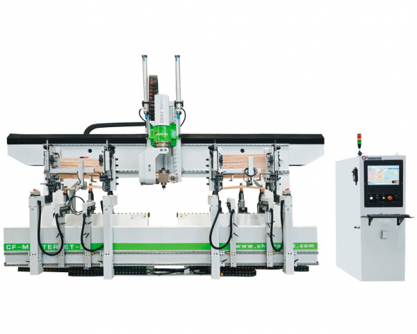 Пятиосевой портальный обрабатывающий центр CF-MASTERJET-32 спроектирован для серийного изготовления элементов столов и стульев. CF-MASTERJET-32снащён двумя рабочими зонами для осуществления непрерывной работы центра в маятниковом режиме, при обработке одного изделия происходит установка новой заготовки. Многолетний опыт производства многоосевого оборудования позволил сконструировать и оснастить обрабатывающий центр наиболее успешными решениями в области фрезерования, сверления и пиления диском. Двойной шпиндель установлен на поворотную голову с расчётом минимизации общих габаритов и возможности работы в труднодоступных местах. Использование пневматических и вакуумных зажимов обеспечивают надёжное крепление заготовки любой геометрической сложности.