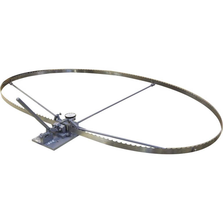 Перед началом работы, устройство жестко фиксируется на рабочем столе. Прижим и развод зуба пилы, производятся одновременно. При нажатии общей рукоятки оператором, усилие передается через систему рычагов на прижим к неподвижной опорной пластине. При дальнейшем толчке, винт толкателя продолжает движение и отгибает вершину зуба пилы. Данная кинематическая схема гарантирует надежную фиксацию пилы в рабочем положении независимо от величины изгиба зуба. Величина развода определяется по шкале индикатора. Устройство позволяет загибать зубья только в одну сторону. Чтобы загибать в противоположную сторону, пилу следует вывернуть «наизнанку». В рабочем положении ленточная пила опирается на опорные планки, закреплённые на станине. Регулировка высоты (по мере износа пилы) производится винтами расположенными по краям станины.