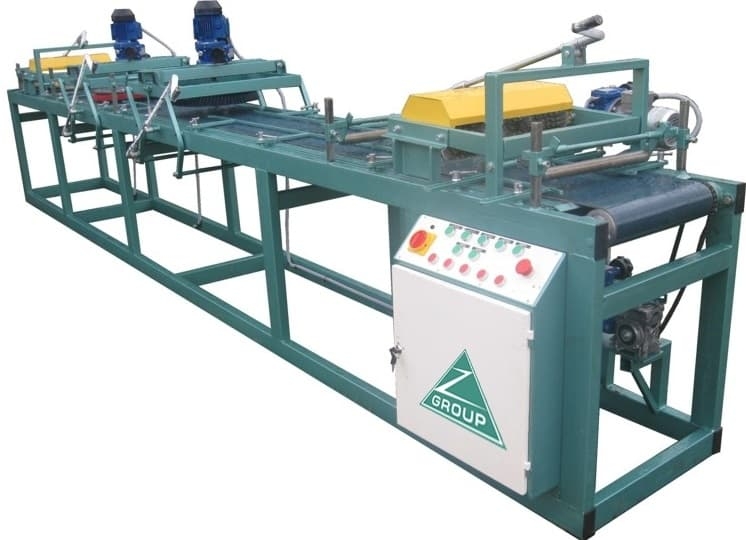 - Функционально состоит из основания с транспортерной подачей заготовки, 2-х регулируемых по высоте узлов с дисковыми щетками и 2-х узлов с цилиндрическими щетками (на входе и выходе из станка).