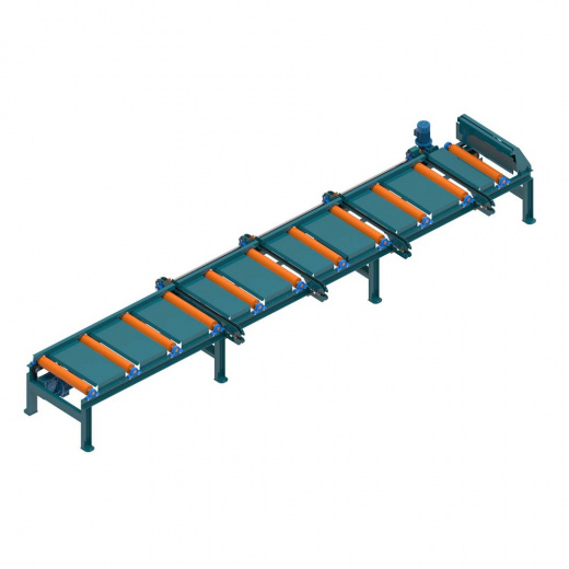 Рольганг с цепным сбросом CRONVER предназначен для бесперебойного приема, транспортировки пиломатериалов и их автоматического сброса в заданную зону (карманы, боковые конвейеры, накопители).после многопильного станка, обеспечивая плавную и надежную транспортировку досок, бруса и других пиломатериалов, включая изделия большого сечения.