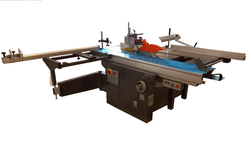 - Для зарезания шипов и пиления поперек волокон и под углом служит пильная каретка, которая имеет большой навесной стол и позволяет раскраивать не только массив но плитные материалы.
