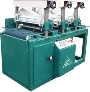 - Функционально состоит из основания с транспортерной подачей заготовки и 3-х регулируемых по высоте узлов с цилиндрическими щетками.
