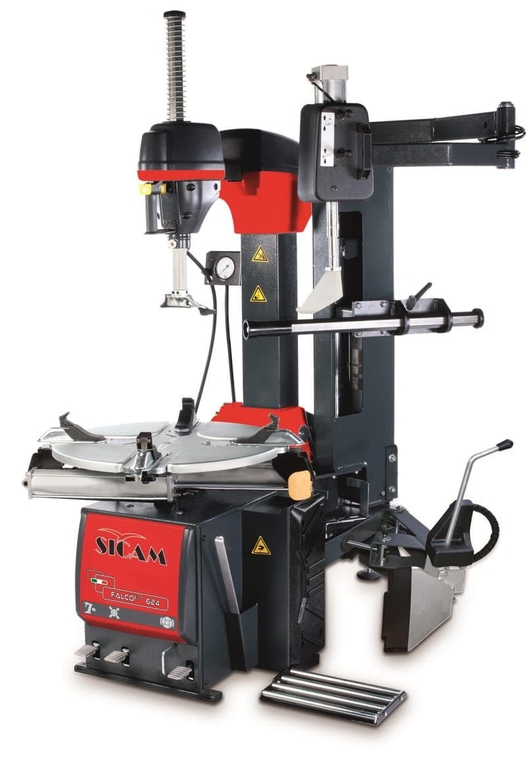 Шиномонтажный стенд автоматический 10-28", третья рука Sicam EVO624S V1 автоматический шиномонтажный станок (монтажная стойка откидывается назад) для сборки и разборки колес легковых автомобилей и легких грузовиков размером до 28 дюймов. Станок позволяет обслуживать колеса из легких сплавов размером до 28 дюймов без дополнительных приспособлений. Имеет мощное отжимное устройство борта покрышки. Усиленная жёсткость конструкции (G-образная рама). Управление положением монтажной стойки производится педалью и кнопкой пневматической блокировки положения лапы. Стол с самоцентрирующимся зажимным устройством диска. Две скорости вращения монтажного стола с управлением при помощи педали. Конструкция станка проста и надежна, имеет большой запас прочности, пригодна для тяжелых условий эксплуатации.
