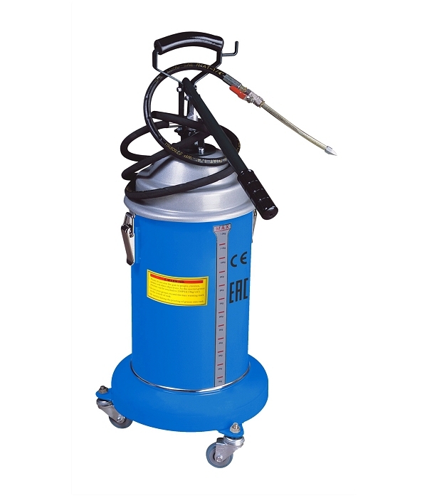 Солидолонагнетатель Trommelberg UZM1208 на шасси с ручным насосом для подачи густых смазок под давлением 125-140 бар. Установка оснащена съемной крышкой, гибким 2.5-м шлангом, металлическим носиком и шаровым краном. Снабжена масломерным окошком.