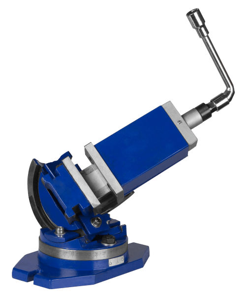 Тиски станочные Stalex WEA 3-х осевые - предназначены для фиксации заготовок под различными углами, применяемых на сверлильных, фрезерных и других видах станков. Предназначены для фиксации на станинах металлообрабатывающего оборудования. Тиски обеспечивают возможность наклона обрабатываемой заготовки на угол от 0 до 90° по 2ум координатам и поворот относительно основания от 0 до 360°. Основные детали тисков, в том числе поворотное основание, изготовлены из мелкозернистого высокопрочного чугуна. Съёмные рифлёные губки изготовлены из закаленной инструментальной стали и отшлифованы. Особенности: • Многоосевые тиски WEA имеют возможность поворота по различным координатным осям (угол наклона заготовки 90° 3ья координата, ±45° 2ая координата и поворот относительно основания от 0 до 360°) • Основными достоинствами данного типа оснастки является высокое усилие зажима, жесткое крепление деталей и возможность проведения высокоточных операций • Съемные рифлёные губки закалены и отшлифованы, обеспечивая большой срок службы при сохранении точности и повторяемости • Винт защищен от грязи и стружки • Подвижная губка усилена увеличенным корпусом • Прочная конструкция, детали тисков изготовлены из мелкозернистого высокопрочного чугуна • Ручка тисков в стандартной комплектации