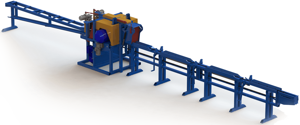Подача сырья в пильный блок, осуществляется с помощью цепного механизма.