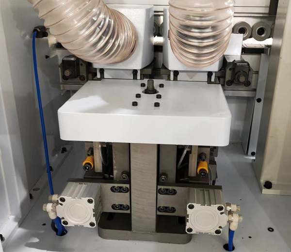 - Фрезерный узел для снятия свесов с вертикальной и горизонтальной настройкой, с двумя высокочастотными двигателями по 0,75 кВт. Радиус фрезы 2 мм;